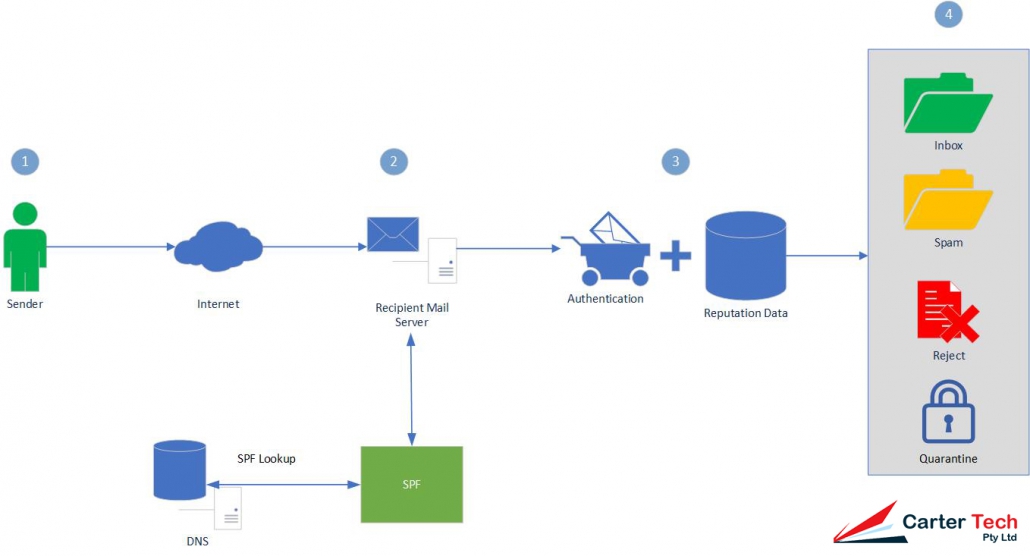 In the diagram you can see that a Sender (1) sends an Email using the Internet which is received by a Recipient Mail Server (2). The recipient server then looks up the SPF data in DNS and authenticates the Email as passing or failing SPF and adds reputation data to the Email header (3). Filters on the server will then decide what to do to with the Email (4) – which can include putting it in a user’s Inbox, Spam folder, rejecting the Email or Quarantining it.