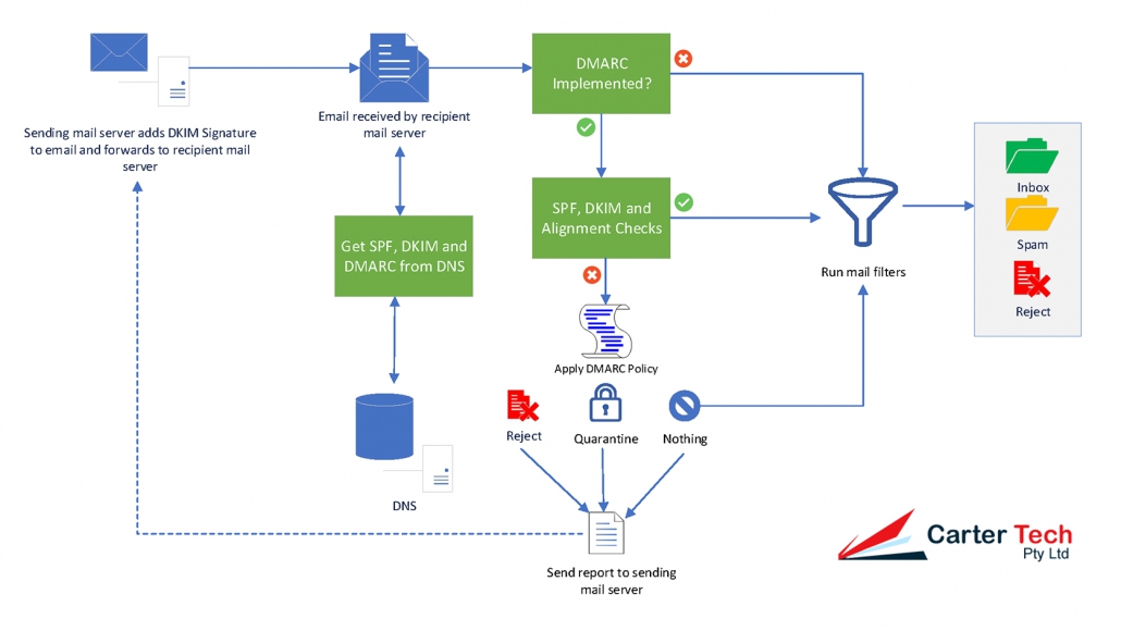 DMARC extends SPF and DKIM and allows the owner of a domain to publish a policy in their DNS records to specify whether DKIM, SPF or both is used when sending email from the domain, how to check the From: field shown to end users, how to deal with failures and how to report actions performed under those policies.