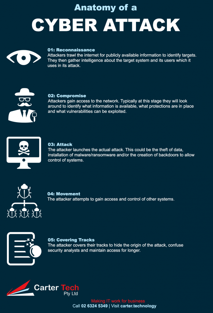 The first step in any cyber attack is reconnaissance. Attackers will trawl the Internet for publicly available information to find a target and will then gather intelligence on the target. Attackers will collect information on network addresses, domain names and network services. They will often scan the network for vulnerabilities and send phishing emails to staff to lure them into providing their credentials or installing an exploit. They will also search for email addresses of staff and send phishing emails to see if they can either lure a user to install an exploit or give up their credentials.